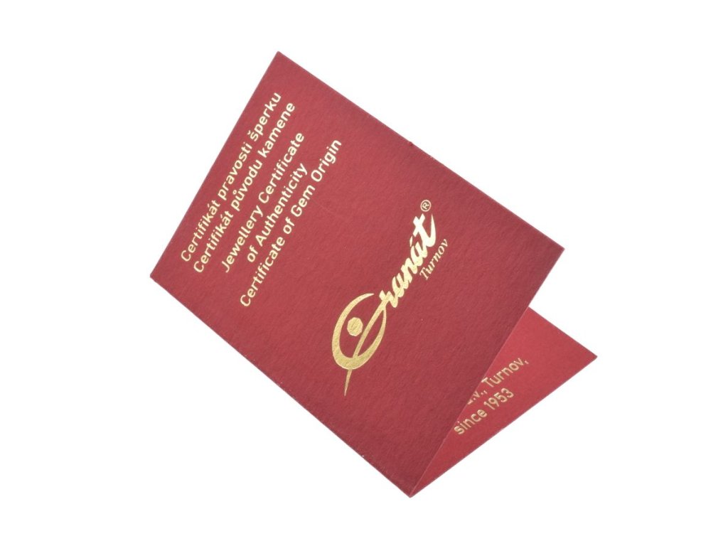 K zakoupenému šperku obdržíte Certifikát pravosti, který potvrzuje, že šperk byl vyroben ve firmě Granát, družstvo umělecké výroby Turnov. Toto družstvo je výhradním vlastníkem práv na těžbu granátové suroviny, vlastní také doly na její získávání a je držitelem ochranné známky a označení původu „Český granát“ a „Český granátový šperk“. Díky tomu máte jistotu, že kupujete originální výrobek s doloženým původem a tradicí.