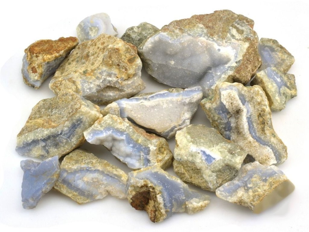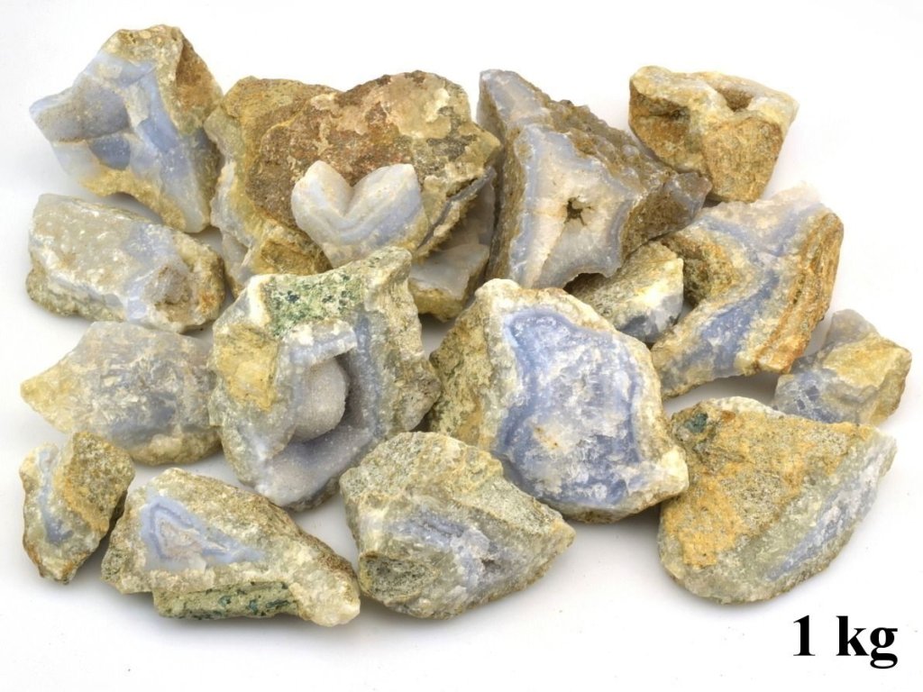 Nabízíme surové kameny modrého chalcedonu o celkové hmotnosti 1 kg. Velikost jednotlivých kusů se pohybuje přibližně mezi 3 až 8 cm.