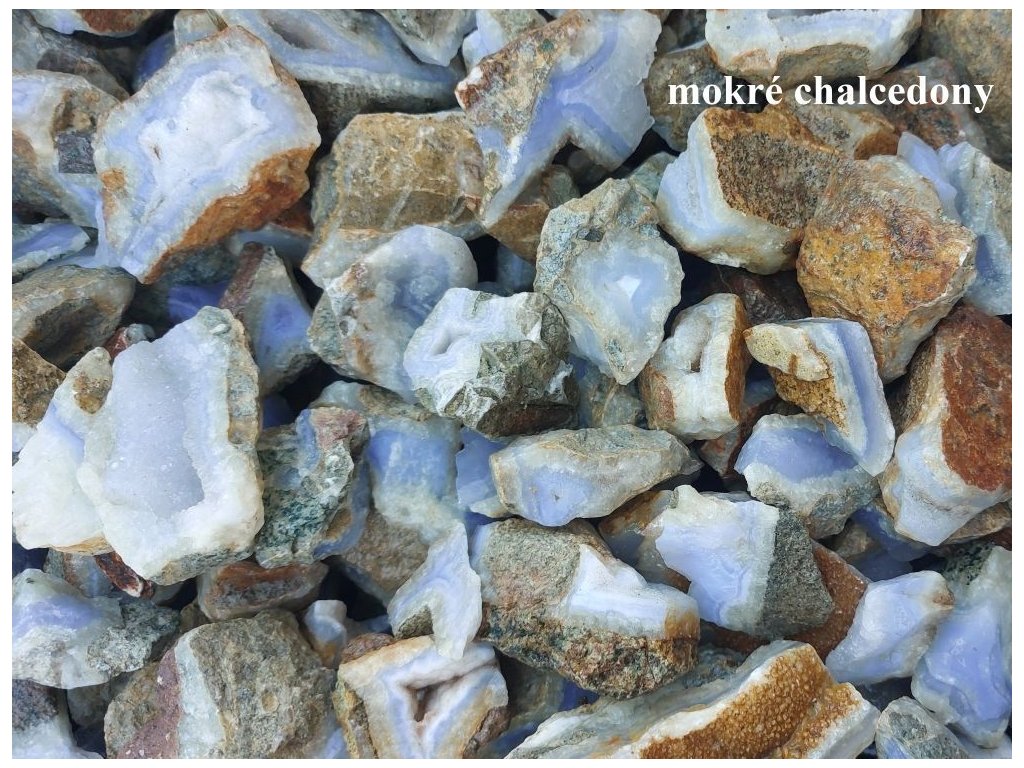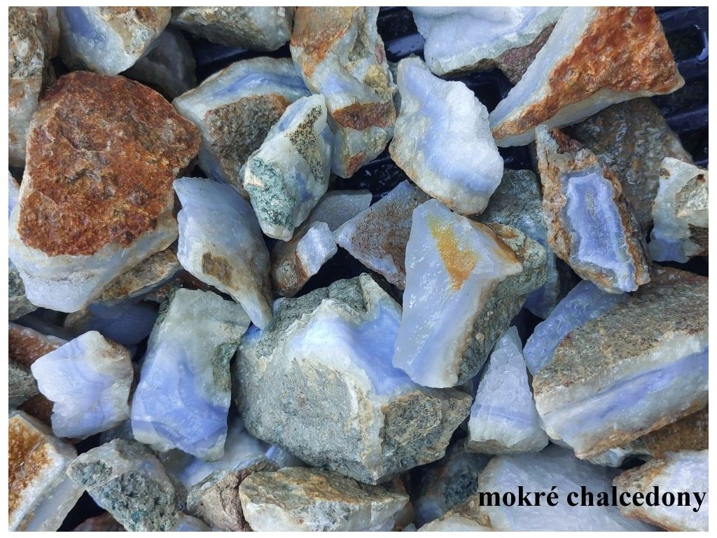 Na této fotografii jsou chalcedony vyfoceny v mokrém stavu, kdy vynikne jejich přirozená modř – snímek vznikl při omývání kamenů během přípravy jednotlivých balení.