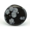 Výběrový kus vločkového obsidiánu. Leskle černý obsidián s šedými krystaly cristobalitu (vysokoteplotní forma oxidu křemičitého SiO2).
