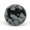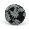 Výběrový kus vločkového obsidiánu. Leskle černý obsidián s šedými krystaly cristobalitu (vysokoteplotní forma oxidu křemičitého SiO2).