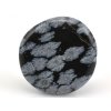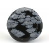 Výběrový kus vločkového obsidiánu. Leskle černý obsidián s šedými krystaly cristobalitu (vysokoteplotní forma oxidu křemičitého SiO2).