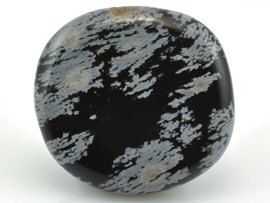Výběrový kus vločkového obsidiánu. Leskle černý obsidián s šedými krystaly cristobalitu (vysokoteplotní forma oxidu křemičitého SiO2).