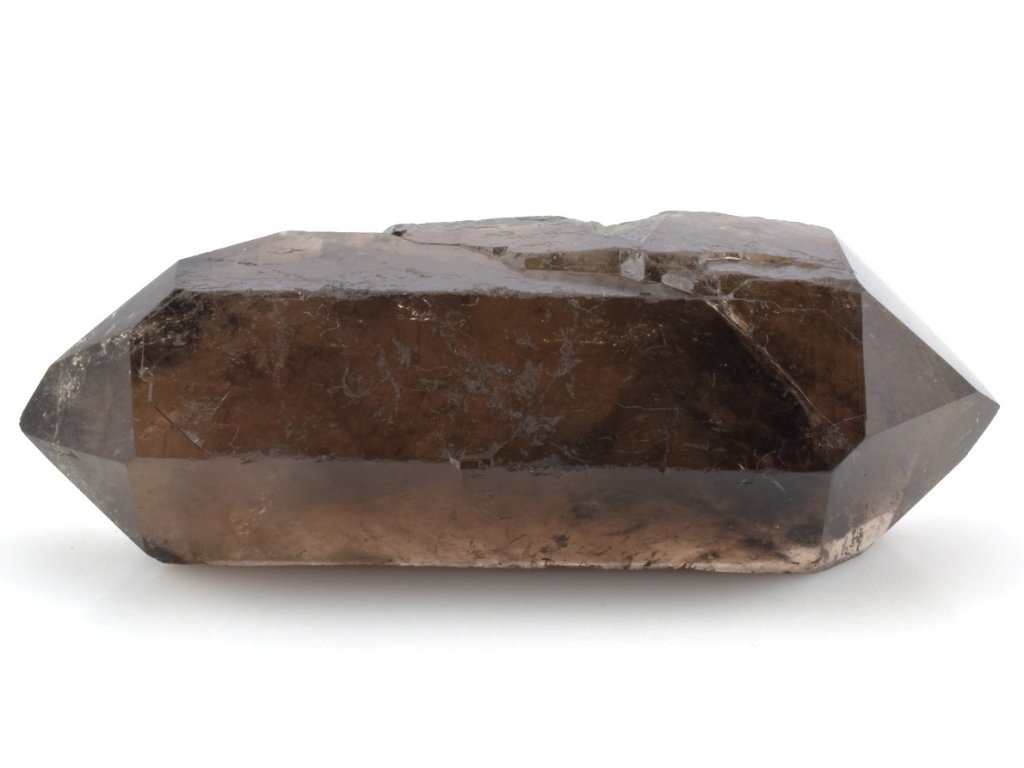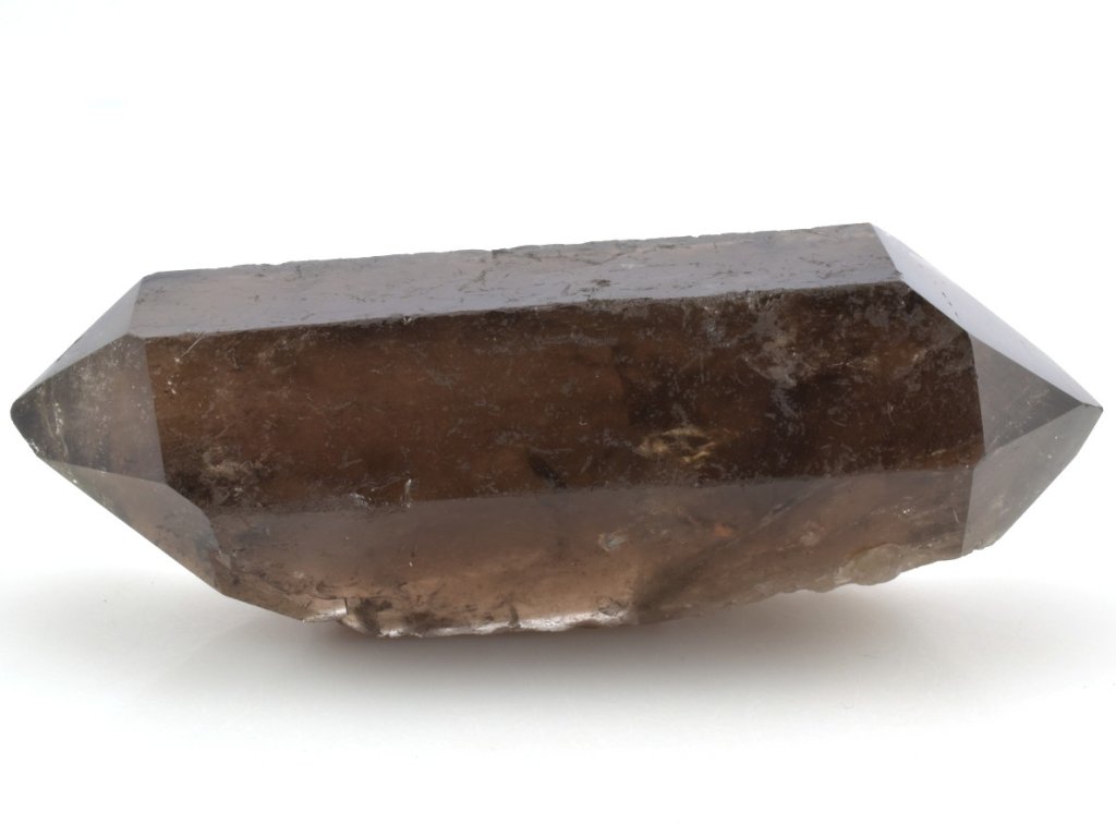 Brazilský krystal záhnědy s broušenými hroty na obou koncích, jejichž plochy jsou vyleštěny do vysokého lesku. Záhněda se v přírodě objevuje v celé škále hnědých odstínů – od světlé a jemně kouřové až po sytě tmavě hnědou. Nejintenzivnější formou je morion, jehož barva může být tak temná, že působí téměř černě.