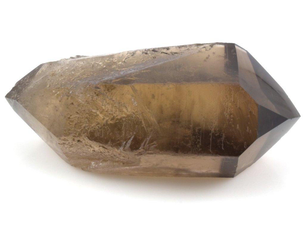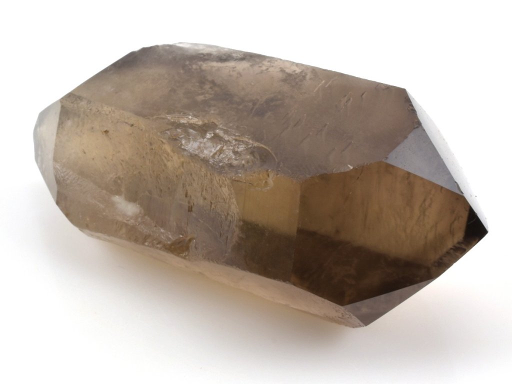 Brazilský krystal záhnědy s broušenými hroty na obou koncích, jejichž plochy jsou vyleštěny do vysokého lesku. Záhněda se v přírodě objevuje v celé škále hnědých odstínů – od světlé a jemně kouřové až po sytě tmavě hnědou. Nejintenzivnější formou je morion, jehož barva může být tak temná, že působí téměř černě.