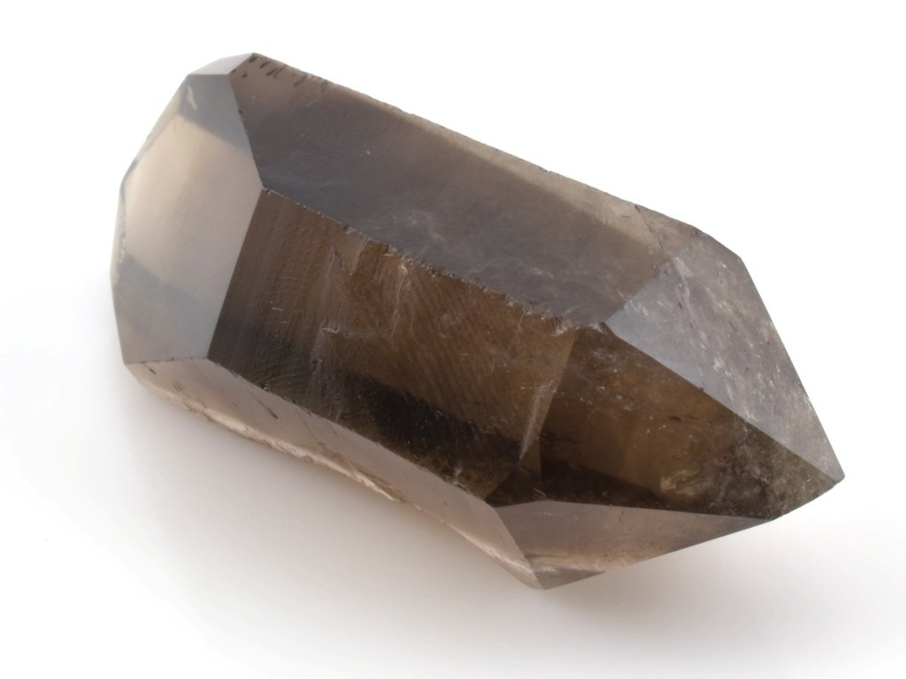 Brazilský krystal záhnědy s broušenými hroty na obou koncích, jejichž plochy jsou vyleštěny do vysokého lesku. Záhněda se v přírodě objevuje v celé škále hnědých odstínů – od světlé a jemně kouřové až po sytě tmavě hnědou. Nejintenzivnější formou je morion, jehož barva může být tak temná, že působí téměř černě.