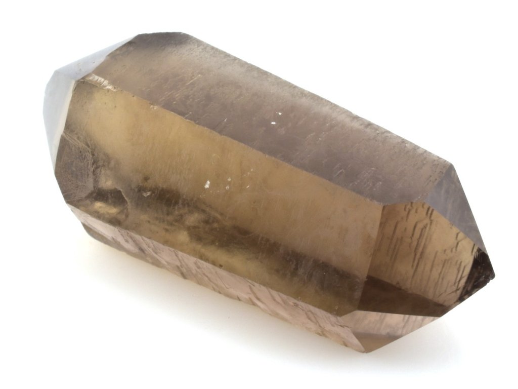 Brazilský krystal záhnědy s broušenými hroty na obou koncích, jejichž plochy jsou vyleštěny do vysokého lesku. Záhněda se v přírodě objevuje v celé škále hnědých odstínů – od světlé a jemně kouřové až po sytě tmavě hnědou. Nejintenzivnější formou je morion, jehož barva může být tak temná, že působí téměř černě.