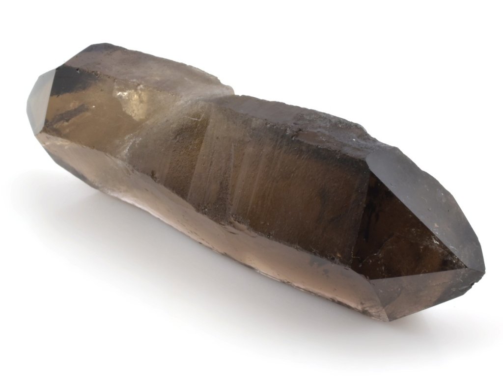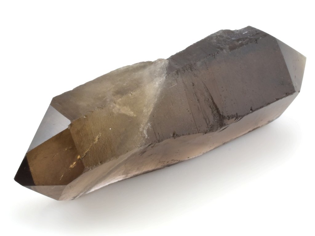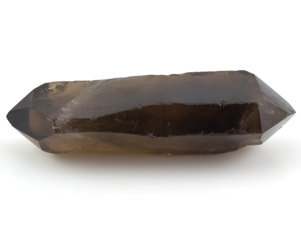 Brazilský krystal záhnědy s broušenými hroty na obou koncích, jejichž plochy jsou vyleštěny do vysokého lesku. Záhněda se v přírodě objevuje v celé škále hnědých odstínů – od světlé a jemně kouřové až po sytě tmavě hnědou. Nejintenzivnější formou je morion, jehož barva může být tak temná, že působí téměř černě.